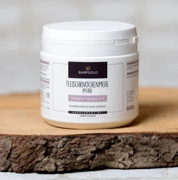Das Fleischknochenmehl Pferd von Barfgold besteht zu 100% aus Pferdeknochen. Dieses wird schonend aus frischen Knochen hergestellt. Das feingemahlene Naturprodukt ist für Hunde und Katzen geeignet. Es enthält hochwertiges Calcium und eignet sich ideal für die Rohfütterung, um die Ration mit Calcium zu ergänzen oder um Knochen durch das Fleischknochenmehl zu ersetzen. Das Fleischknochenmehl ist geeignet zur Unterstützung in Wachstumsphasen, bei einer Trächtigkeit oder im Senioren Alter. Verwendbar für futtersensible Tiere.