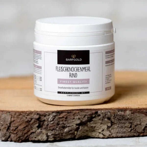 Unser Fleischknochenmehl Rind besteht zu 100% aus Rinderknochen. Dieses wird schonend aus frischen Knochen hergestellt. Das feingemahlene Naturprodukt ist für Hunde und Katzen geeignet. Es enthält hochwertiges Calcium und eignet sich ideal für die Rohfütterung, um die Ration mit Calcium zu ergänzen oder um Knochen durch das Fleischknochenmehl zu ersetzen. Das Fleischknochenmehl ist geeignet zur Unterstützung in Wachstumsphasen, bei einer Trächtigkeit oder im Senioren Alter.