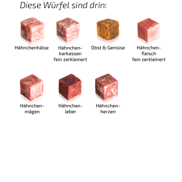 Hähnchenhälse, Hähnchenkarkassen, Obst & Gemüse-Mix (Apfel, Gurke, gekochte Kartoffel, Kräuter, Rote Bete, Banane, Zucchini, Eisbergsalat, Karotte, Mineralstoffe), Hähnchenfleisch (fein zerkleinert, MDM*), Hähnchenmägen, Hähnchenleber, Hähnchenherzen.