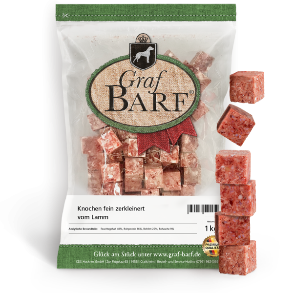Der Knochenwürfel aus fein zerkleinerten Brust- und Rippenknochen vom Lamm eignet sich besonders für sehr kleine Hunde, Junioren und Senioren.