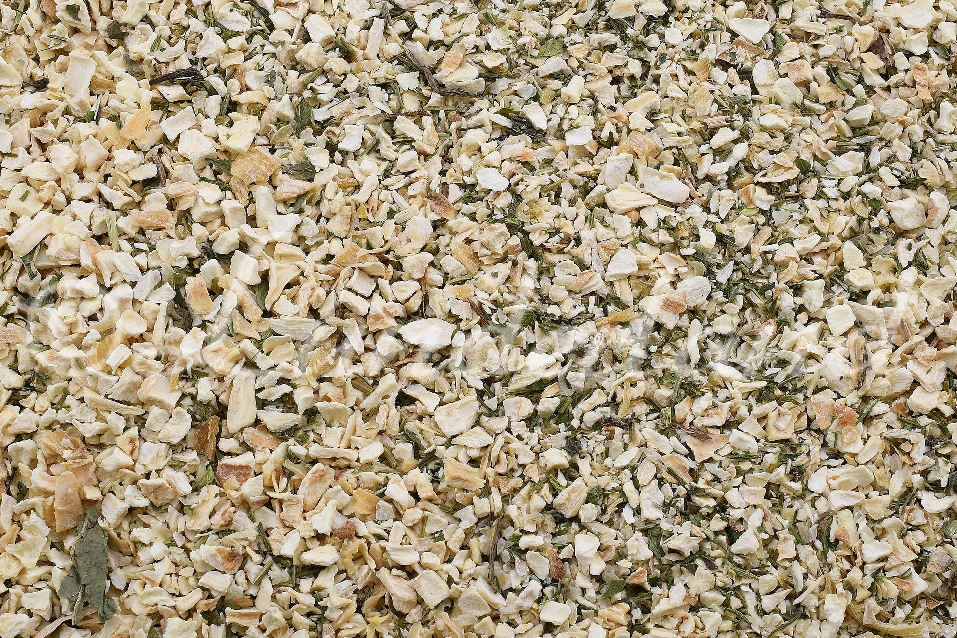 Diese Gemüsemischung ist die ideale alltägliche Fleischergänzung. Besonders profitieren hier Tiere, deren Fell keinen Rotstich entwickeln soll.